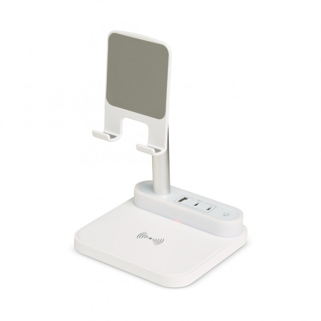 Descrição: Base de carregamento com suporte retrátil para celular e luminária integrada. Com opções de carregamento via indução ou via cabo, nossa base é prática e funcional. Produzida em plástico com apoios antideslizantes, a base possui duas entradas Tipo-C, uma entrada USB e uma saída Tipo-C. Acompanha um cabo USB Tipo-C. OBS.: A BASE APENAS TRANSFERE CARGA, ELA NÃO POSSUI BATERIA PARA ARMAZENAMENTO (NÃO É UM POWER BANK).