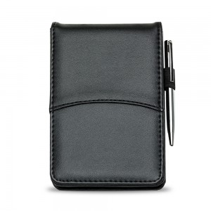 Descrição: Bloco de anotações de couro sintético com suporte para caneta, frente e verso liso. Abertura superior, possui espiral prata e acompanha aproximadamente 95 folhas brancas sem pauta e suporte na lateral direita para caneta(não acompanha). OBS.: PEDIDOS APENAS MÚLTIPLOS DE 10 PEÇAS!
